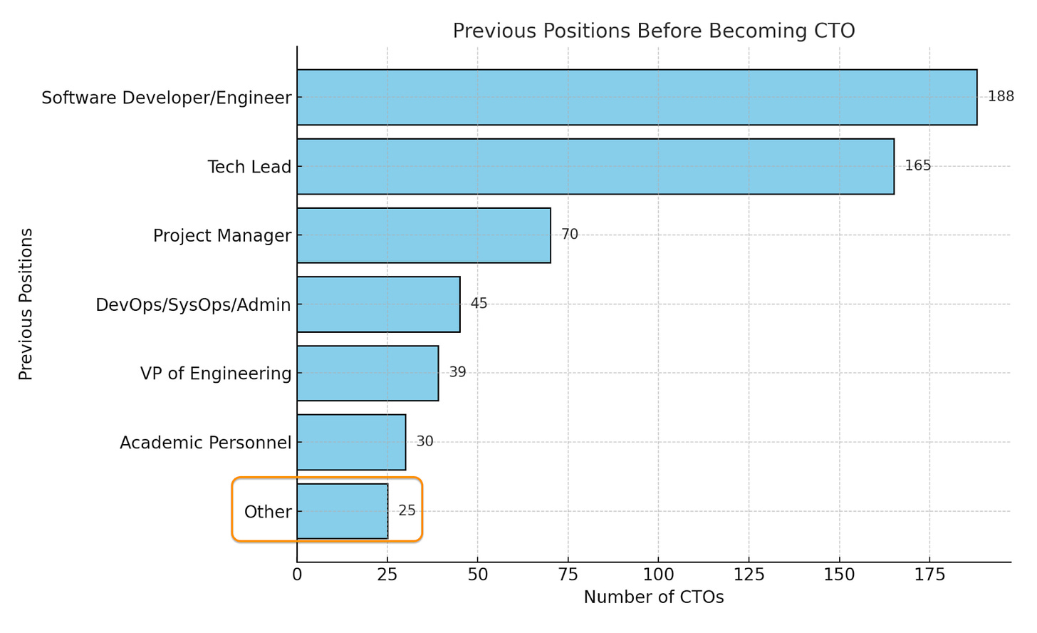 I recently came across a global consulting company called STXNext, which surveyed over 250 CTOs* about the positions they held before becoming CTOs. Their findings weren’t surprising to me.1